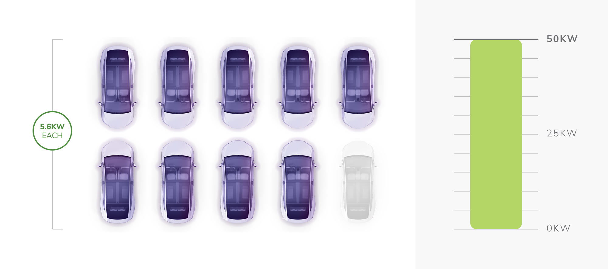 Conversely, if ten EVs are plugged in and one finishes charging, the power would be redistributed to the other nine chargers at 5.6kW each. This way, all the EVs will be charged as efficiently as possible.